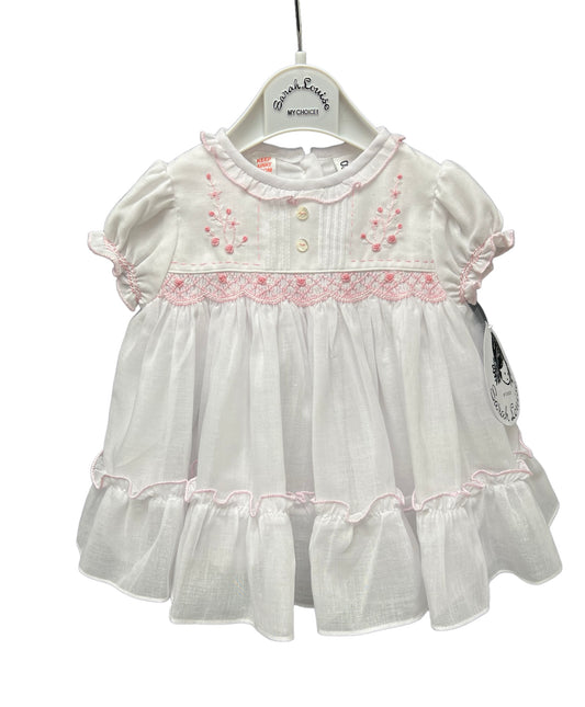 Sarah louise - White Hand smocked dress with pale blue and pink trim