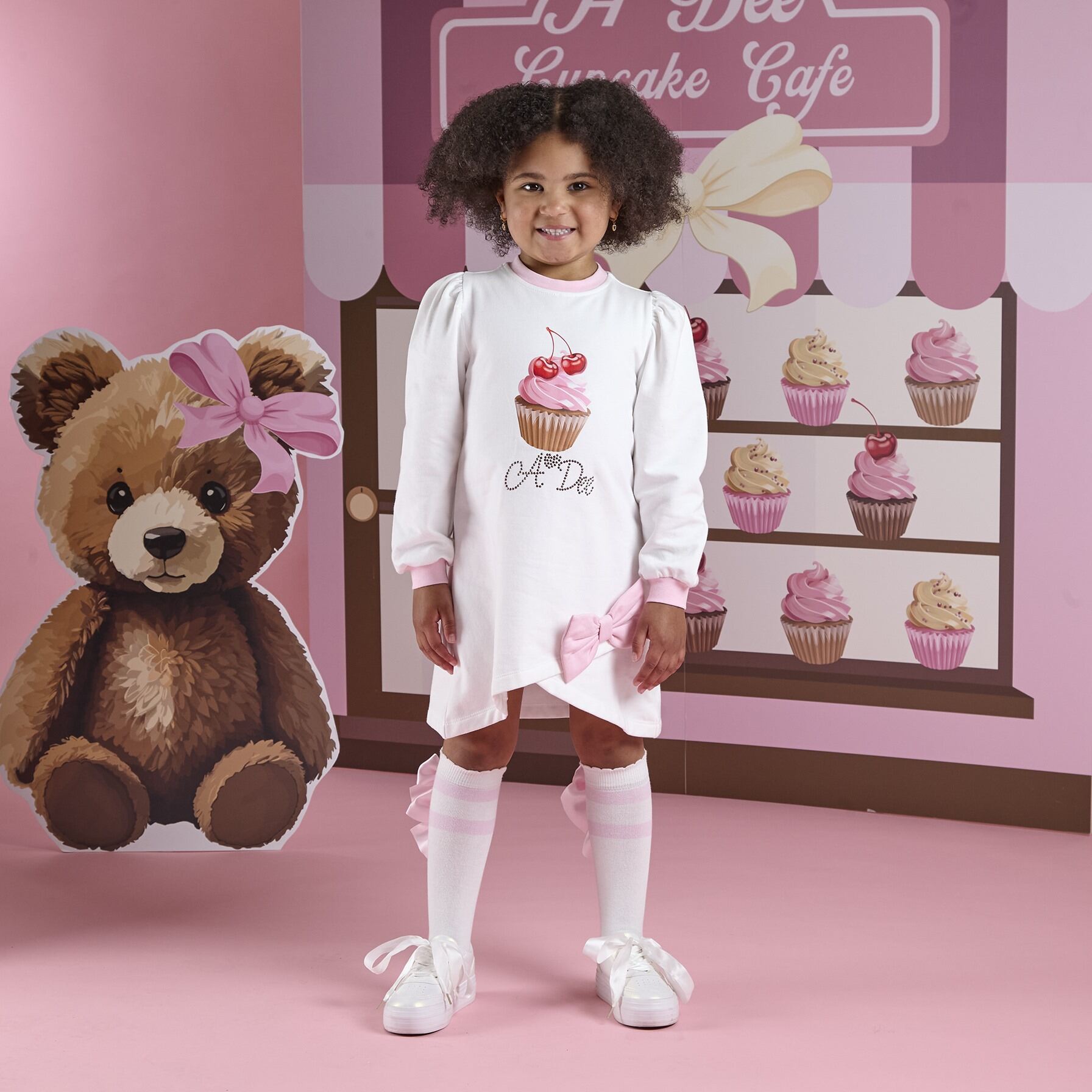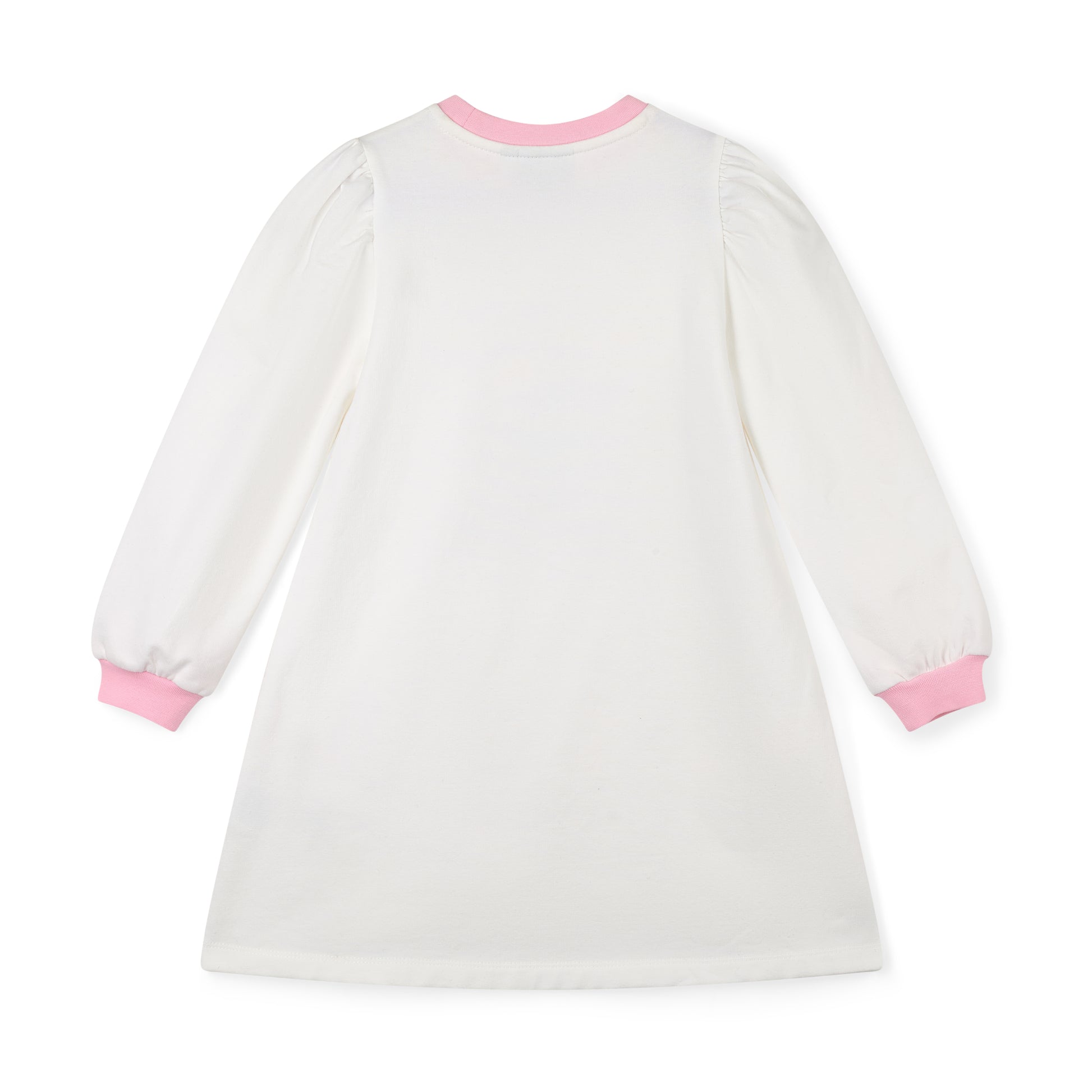 The Michelle sweat dress features a unique teddy bear bakery artwork on the front with an even cuter bow detail at the side. Complete with puff sleeves.