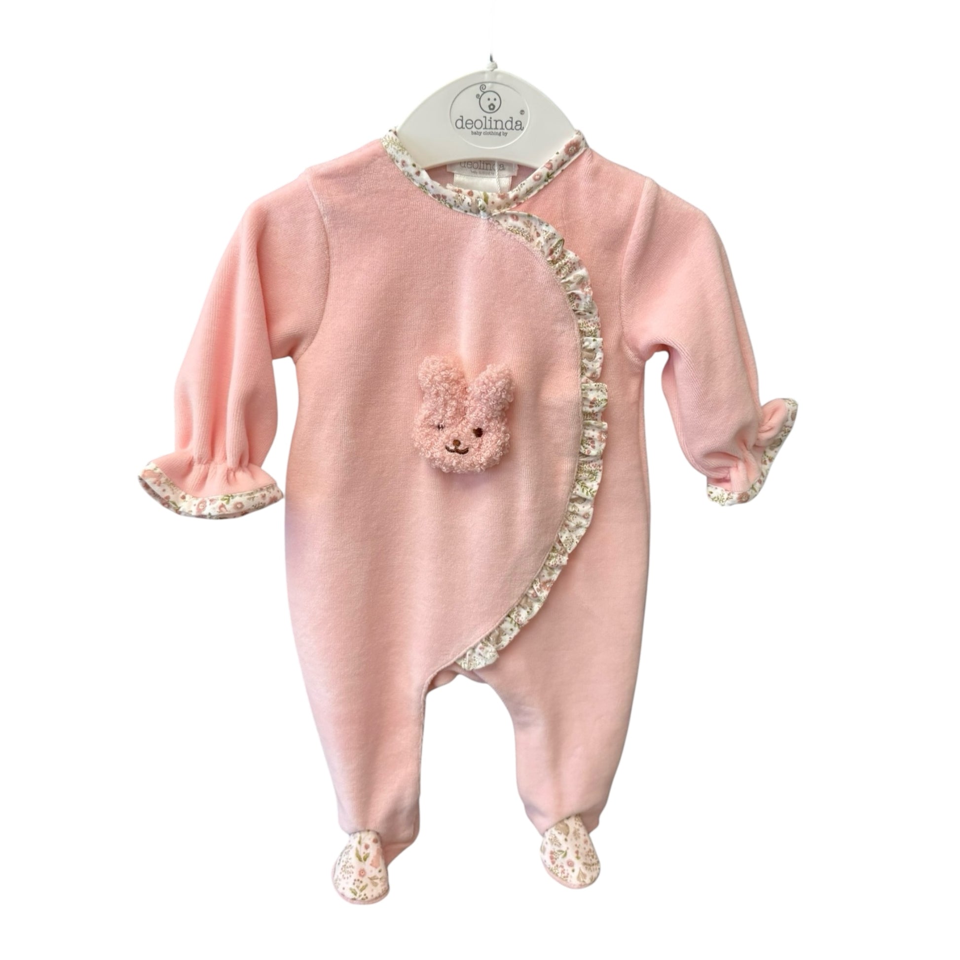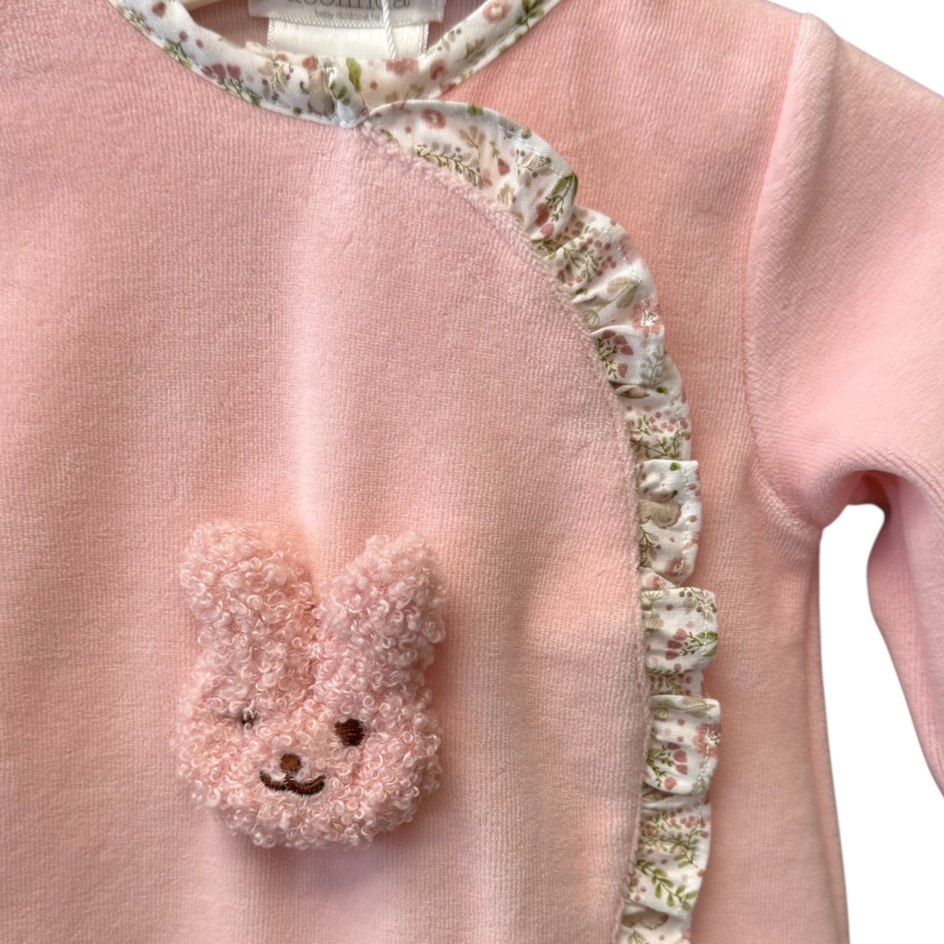 Pink velour romper with squirrel/floral print trim