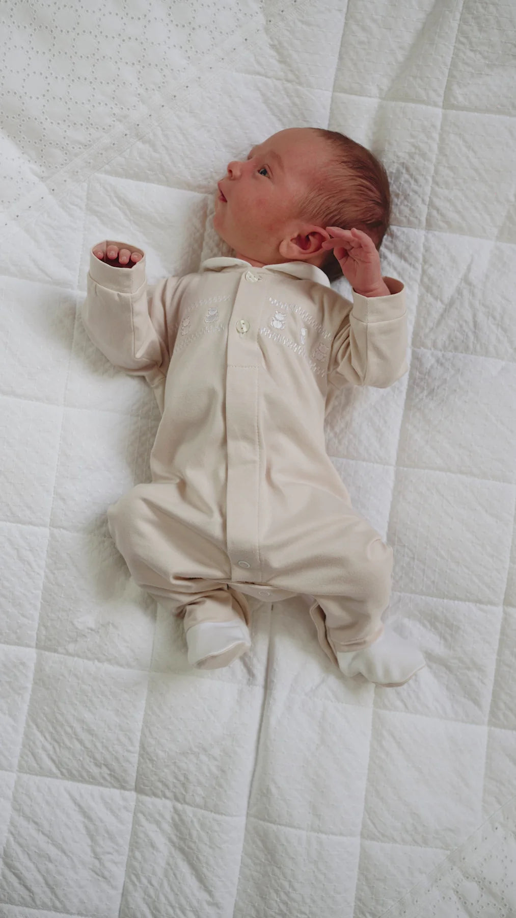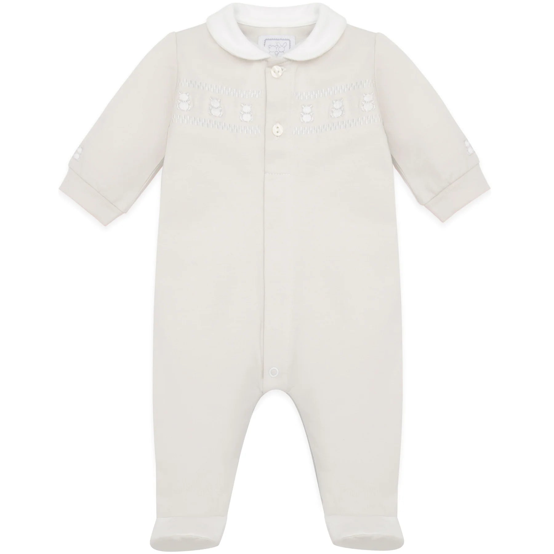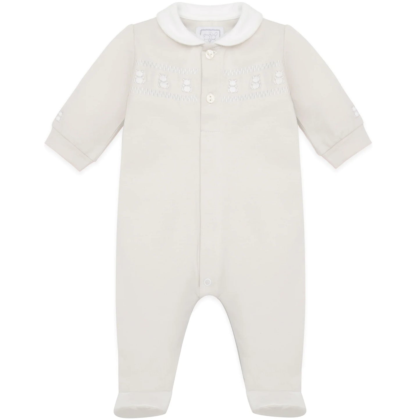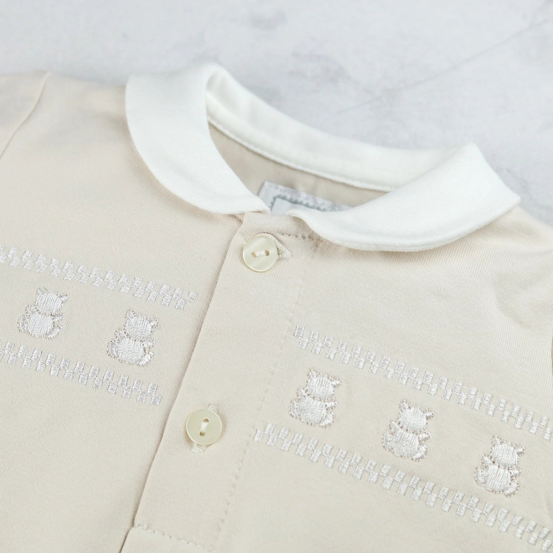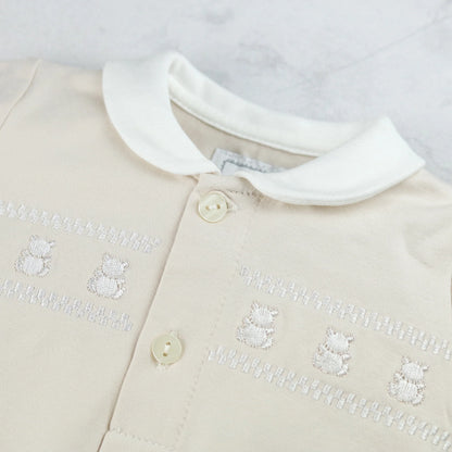 Beige all in one with teddy bear embroidery across chest