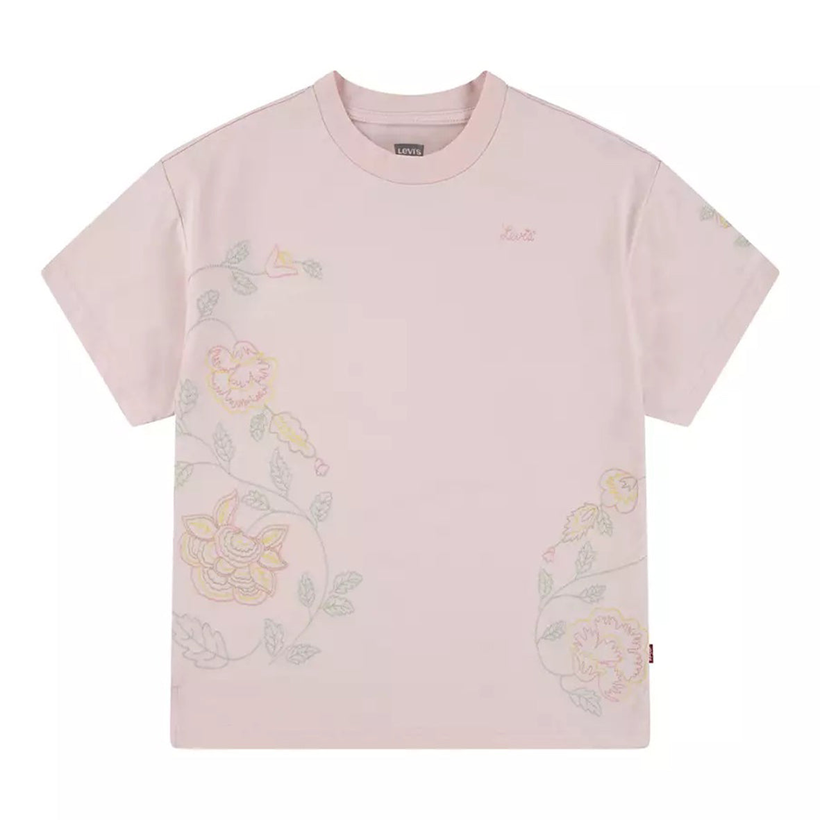 Soft pink t-shirt with stitched floral pattern and logo