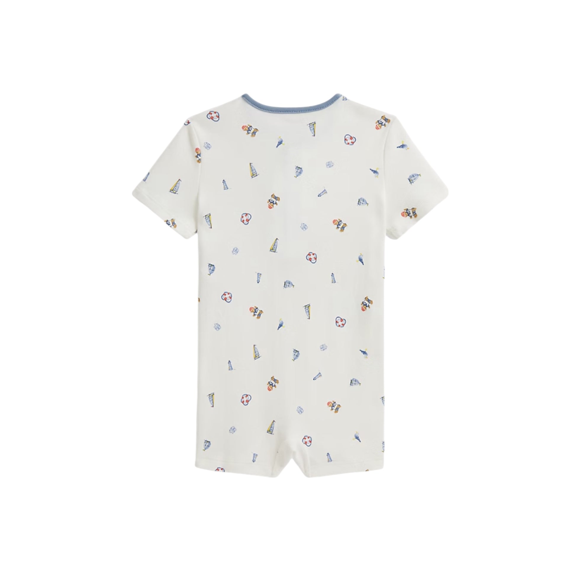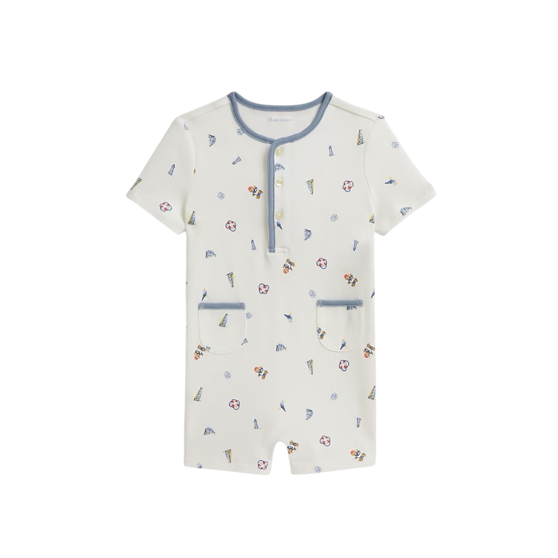 Ahoy, little sailor! This adorable Ralph Lauren shortie romper brings seaside charm straight to your child's wardrobe. Crafted from sumptuous soft cotton, it features an all-over nautical print that's bursting with character and style. The relaxed fit makes it effortless to slip on and off. Designer quality meets everyday comfort—your little one will look absolutely nautical-chic while staying cosy and content all day long.