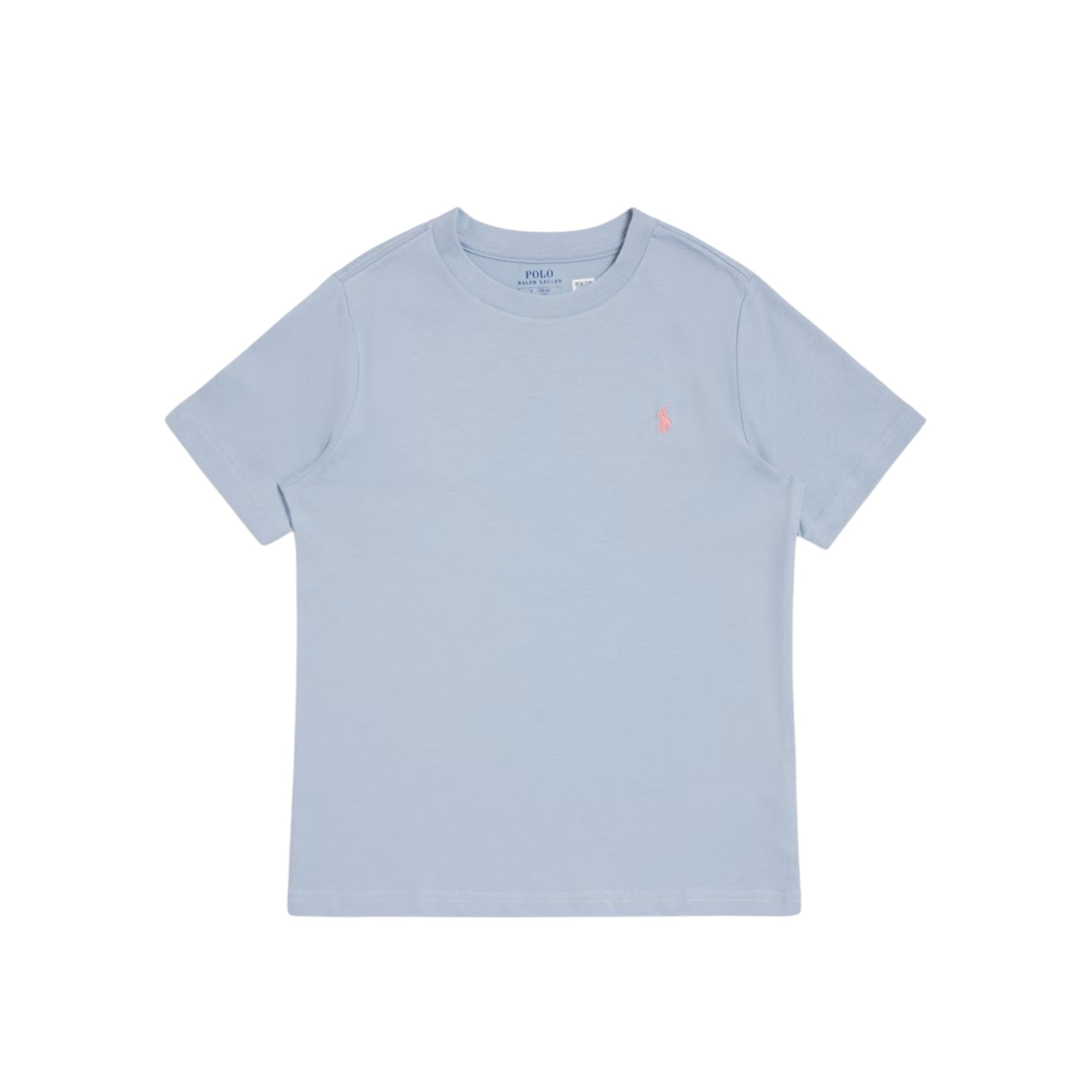 Pae blue crew neck T-shirt with pink embroidered signature polo logo on left chest
