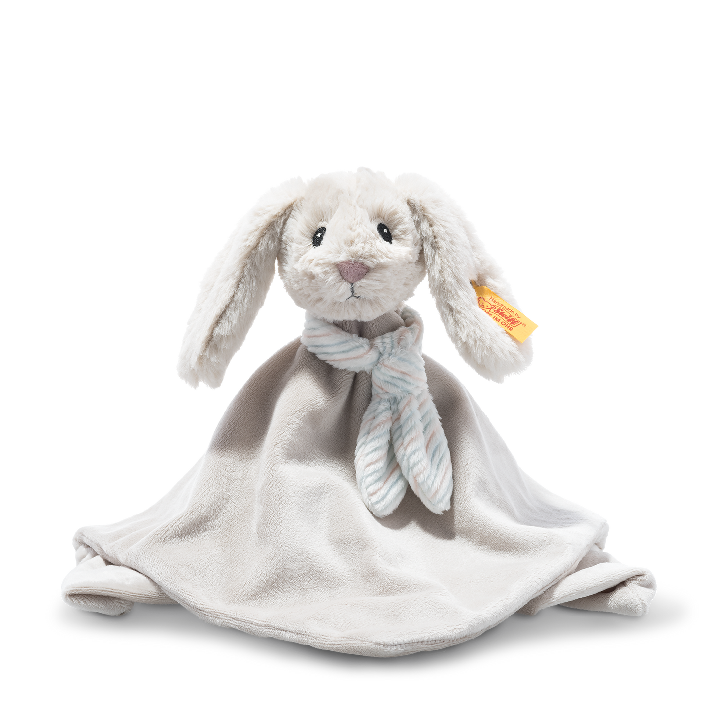 Measuring 26 cm tall, Soft Cuddly Friends Hoppie rabbit comforter is made of plush suitable for baby’s delicate skin and feels wonderfully soft. She has long ears, a round head with embroidered eyes, nose and mouth, and a little striped scarf ... and not forgetting the pale grey comforter itself! Thanks to the finger puppet function, older siblings will be able to re-enact their favourite stories for their little brother or sister with the imaginative and adventurous Hoppie rabbit, and make up their own adventures in the land of cuddly toys. This item goes with the Steiff tonies® series but comes without a chip!